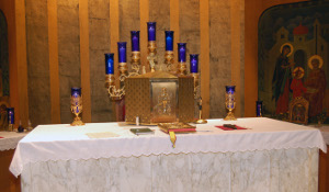 The Holy Table stands at the center of the sanctuary. It represents both God’s Heavenly Throne (Isaiah 6) and the tomb in which our Lord’s body rested for three days for our salvation. Christ is present in His Church in several ways: in the real presence of the Holy Eucharist; in the inspired words of the Gospels; and through the medium of the holy icons.