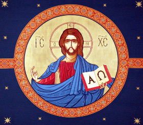 The World rediscovers its original created goodness only when it acknowledges God as Lord. Therefore, the icon of Christ, Pantocrator (He who holds the whole World in His hands) looks down from the ceiling. In the Church, Jesus Christ is Lord to the glory of God the Father. The icon of Christ, Pantocrator, also reminds us that, when the Church worships, it participates in a foretaste of the life of Heaven, described in Isaiah 6 and Revelation 21. This fact is expressed by the heavenly blue, star-dappled ceiling. Sharing the worship of the angels and saints, we are, in the words of the Epistle to the Hebrew 12:1, “surrounded by so great a crowd of witnesses”. In many Byzantine Churches, the walls are entirely covered with icons of saints. Our own Church is surrounded by the witness of the 12 apostles, whose framed icons hanging between the windows come from our original church on 19th and Passyunk and date back to 1894.