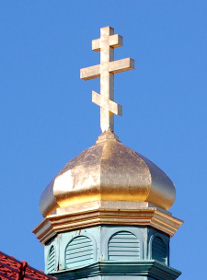The best-known symbol of our Byzantine Catholic faith is the “three barred cross” which rises from the dome. The cross on which Jesus was crucified was composed of an upright pole and a crossbeam. To it was affixed the title or charge, “Jesus of Nazareth, King of the Jews” … (INRI in Latin initials). A smaller plank may have served as a footrest. This is the historical reason for the two “extra” bars. Byzantine Catholics also have symbolic attachments to the three barred cross. Tipped upright, the third bar reminds us that Jesus’ death opened the gates of Heaven for us; that one thief crucified with Him went to Heaven. A deeper symbolism is that, even in His painful death, Christ remained the True God in glory and the Earth and even the Cross was His footstool as Psalm 95.5 says. It is our custom, upon entering our Church, to make the sign of the Cross once or three times. This we do with the first three fingers of the right hand joined together to symbolize the three persons of the Holy Trinity. The last two fingers, folded into the palm, recall the two natures of Jesus Christ, True God and True Man. Our manner of blessing, from the right shoulder to the left, is the original Christian custom, which was reversed in Italy in the 11 th century.